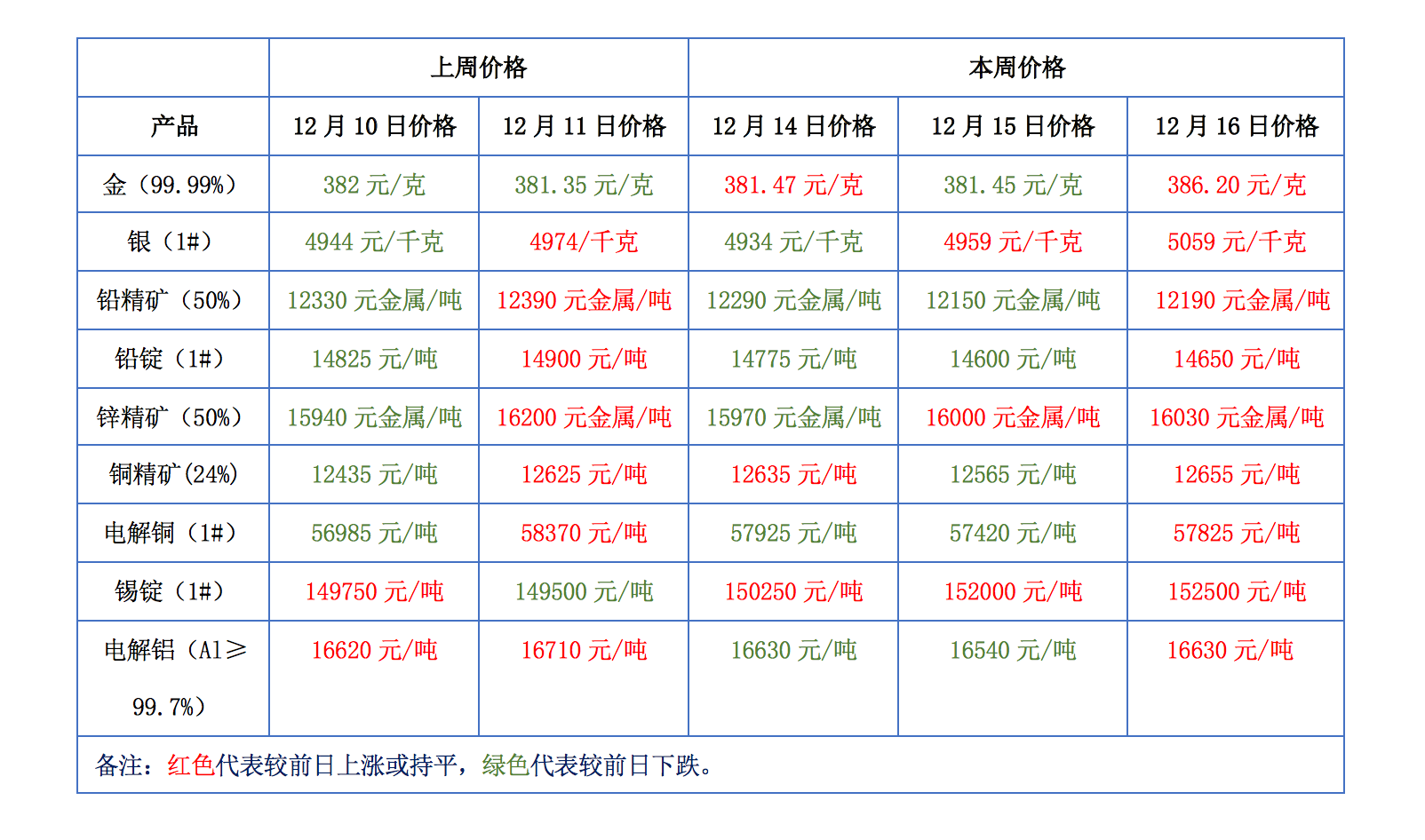 下表為本周金、銀、鉛、鋅、銅、鋁等主要有色金屬礦產(chǎn)品價(jià)格變動(dòng)情況: