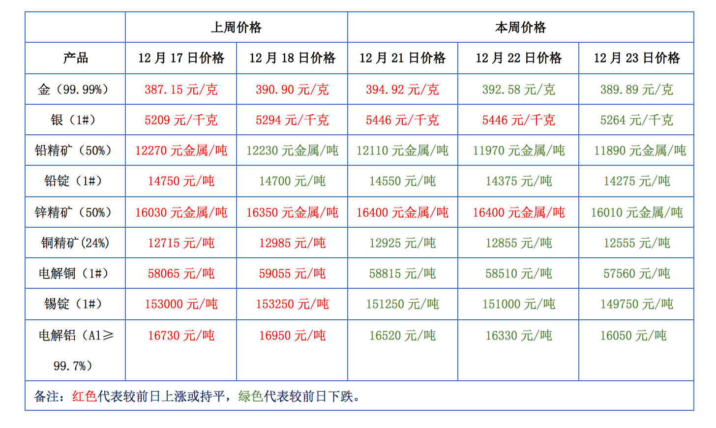 下表為本周金、銀、鉛、鋅、銅、鋁等主要有色金屬礦產(chǎn)品價格變動情況: