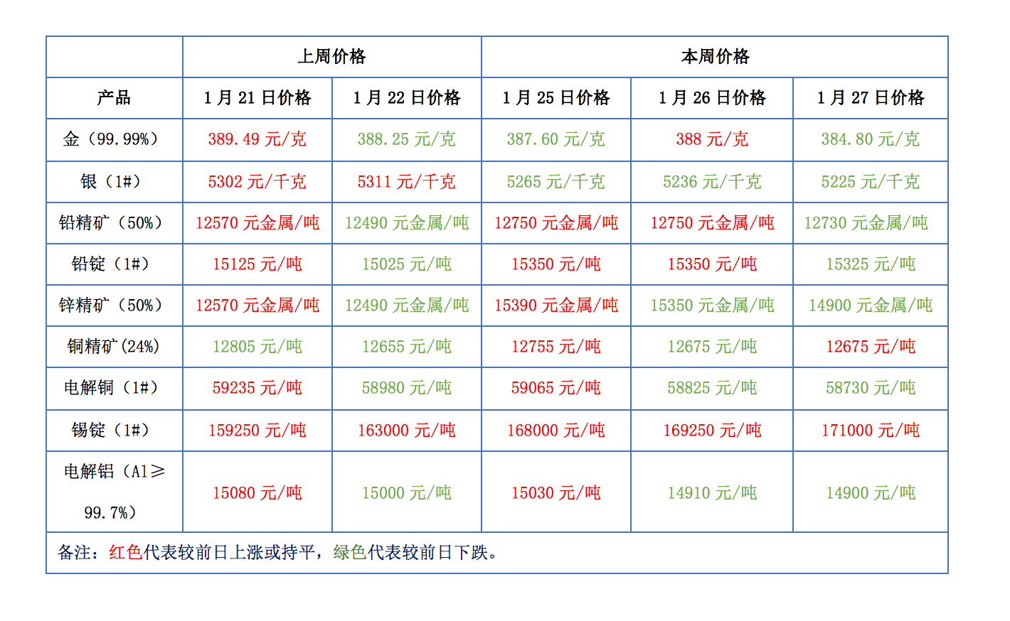 下表為本周金、銀、鉛、鋅、銅、鋁等主要有色金屬礦產(chǎn)品價(jià)格變動(dòng)情況: