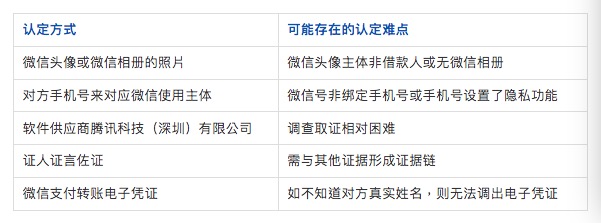 1、關(guān)于借款主體身份的確認(rèn):通過(guò)微信轉(zhuǎn)賬方式而發(fā)生的借款,在認(rèn)定借款法律關(guān)系成立的首要環(huán)節(jié)是明確借款人的身份主體信息,故出借人在向法院主張被告履行還款義務(wù)時(shí),出借人需證明自己微信轉(zhuǎn)賬的對(duì)象與被告為同一主體,如若不能證明微信使用人系借款人,則微信證據(jù)在法律上將與案件無(wú)法產(chǎn)生關(guān)聯(lián)性。在司法實(shí)踐中主要存在五種認(rèn)定微信主體身份的方式,相應(yīng)的也都存在一些認(rèn)定的難點(diǎn):
