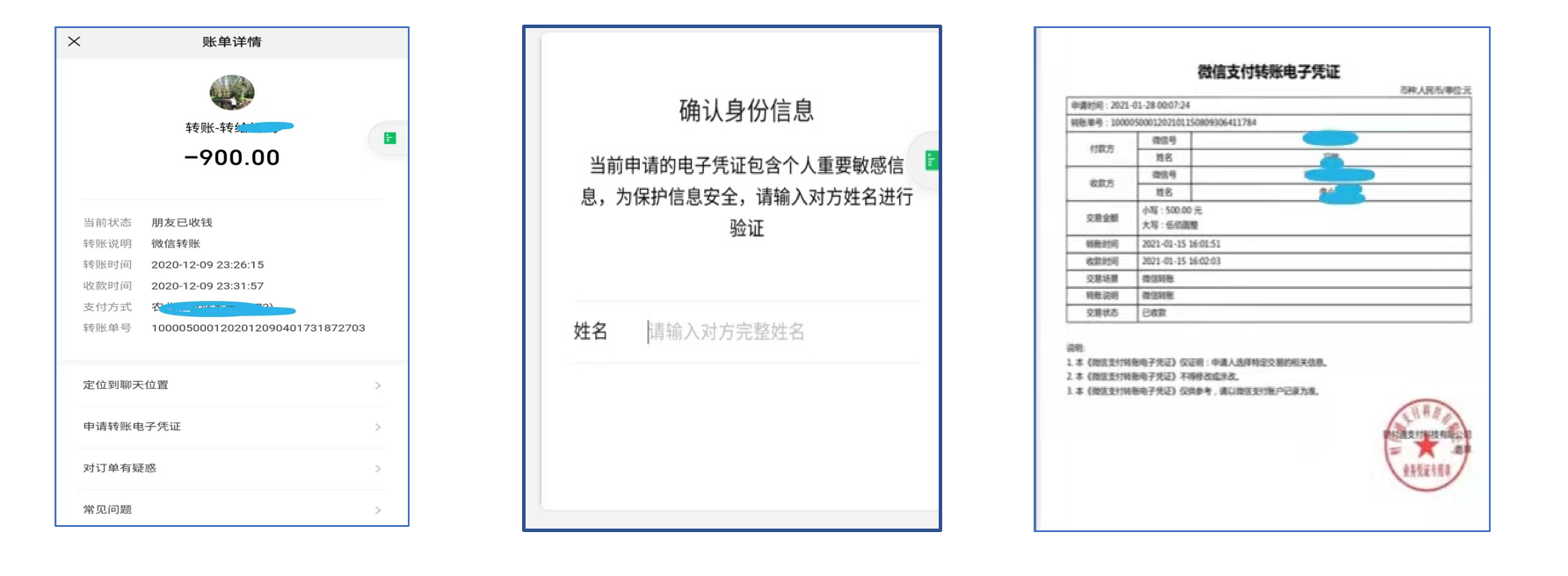 2、如果出借人明確知道借款人的真實(shí)姓名,則可以在微信賬單明細(xì)里調(diào)出電子轉(zhuǎn)賬憑證,此憑證上會(huì)明確寫(xiě)明借款人的姓名、借款金額、借款時(shí)間以及交易狀態(tài)。