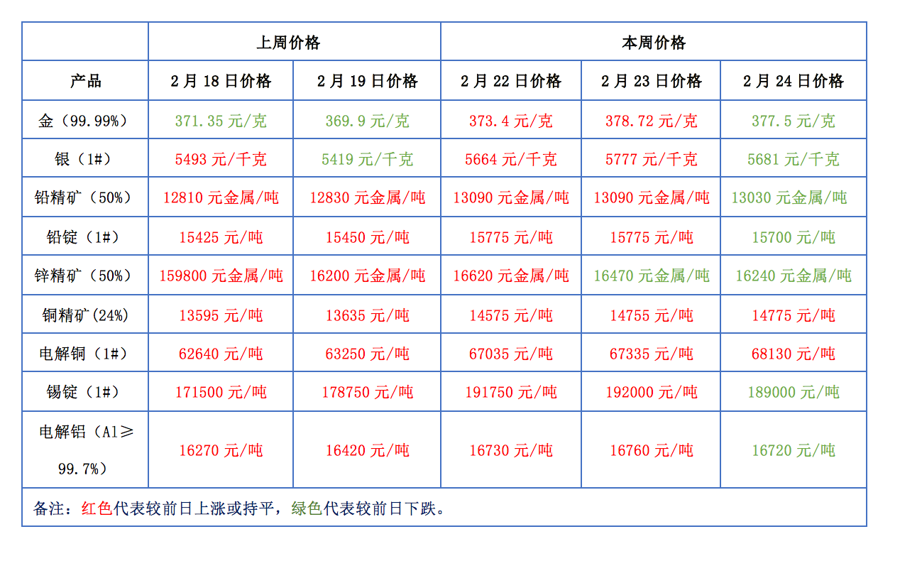 下表為本周金、銀、鉛、鋅、銅、鋁等主要有色金屬礦產(chǎn)品價(jià)格變動(dòng)情況: